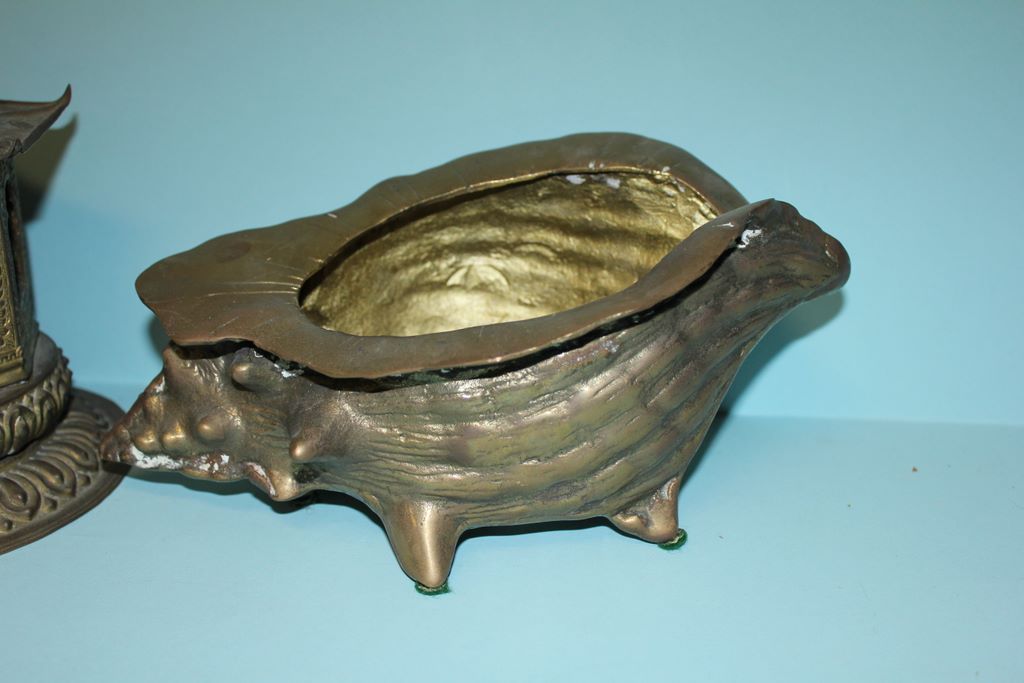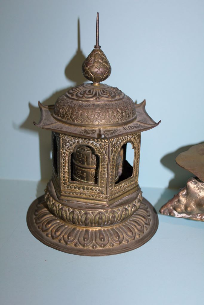 Six pieces of old brass: An intricately embossed c1900 Chinese 10"h sheet brass Pagoda with a prayer wheel inside, a finely wrought c1890 Japanese 8"w narcissus bowl with an engraved floral spray, a c1920 China brass engraved oval footed 7"w bowl, a contemporary 10"w brass conch, and two small India brass ashtrays. Six pieces of old brass: An intricately embossed c1900 Chinese 10"h sheet brass Pagoda with a prayer wheel inside, a finely wrought c1890 Japanese 8"w narcissus bowl with an engraved floral spray, a c1920 China brass engraved oval footed 7"w bowl, a contemporary 10"w brass conch, and two small India brass ashtrays.