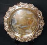 A fine c1906 American Silver Company World Brand silverplate footed tray with an ornate grape & grape leaves borders, hand-engraved center well, 10 1/2" dia. Likely a go-along piece for their "Moselle" pattern. A fine c1906 American Silver Company World Brand silverplate footed tray with an ornate grape & grape leaves borders, hand-engraved center well, 10 1/2" dia. Likely a go-along piece for their "Moselle" pattern.