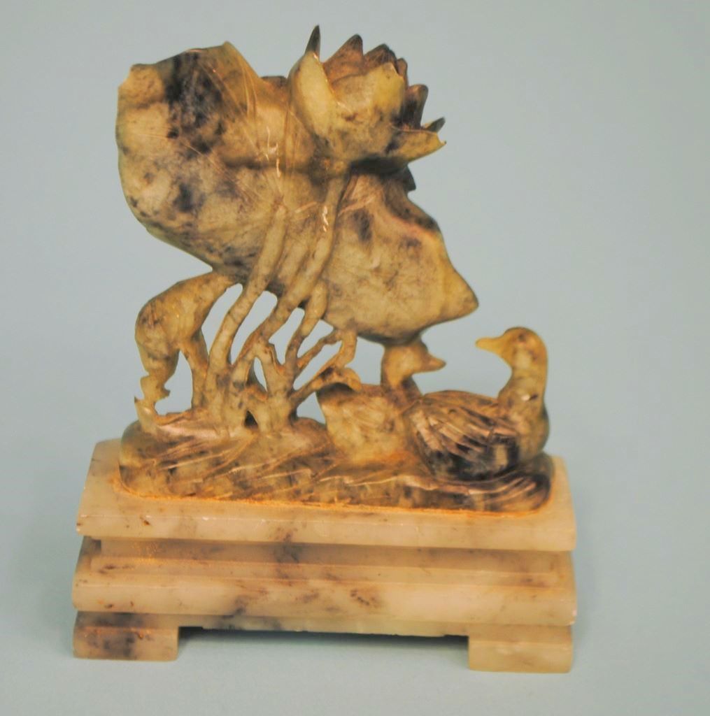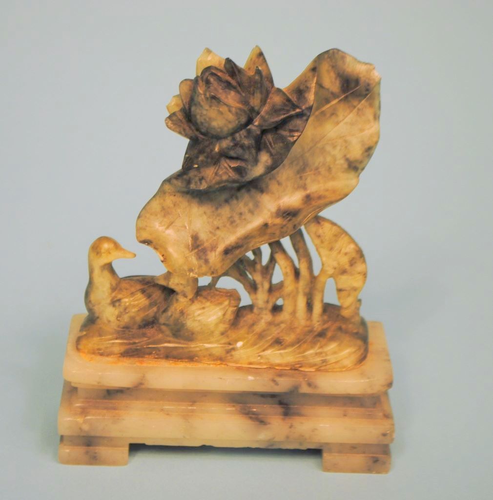 Soapstone Carving of Ducks and Lotus Blossom, on stepped soapstone base, H. 4 7/8" Soapstone Carving of Ducks and Lotus Blossom, on stepped soapstone base, H. 4 7/8"