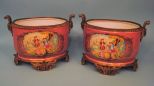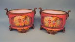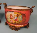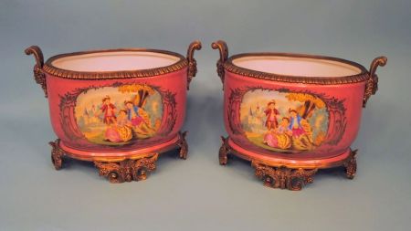 Pair of Monumental Hand-Painted Ormolu Bronze Centerpieces, pink background courtship scene trimmed in elaborate brass; pseudo sevres mark, 10" H x 16" W Pair of Monumental Hand-Painted Ormolu Bronze Centerpieces, pink background courtship scene trimmed in elaborate brass; pseudo sevres mark, 10" H x 16" W