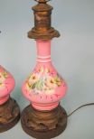 Pair of 19th Century Pink Old Paris Carcel Lamps, pink background hand-painted with flowers, 24 1/2" H., 5" dia. Pair of 19th Century Pink Old Paris Carcel Lamps, pink background hand-painted with flowers, 24 1/2" H., 5" dia.