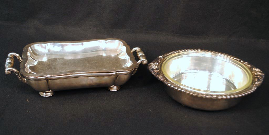 Two Silverplate Bowls; Reed & Barton/Staffordshire round bowl with Pyrex liner, 11" dia.; Rectangular, two handled casserole with Silverplate liner, 13 1/2" dia., 3" H. Two Silverplate Bowls; Reed & Barton/Staffordshire round bowl with Pyrex liner, 11" dia.; Rectangular, two handled casserole with Silverplate liner, 13 1/2" dia., 3" H.