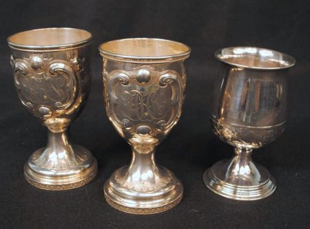 Three Silverplate Goblets; pair ornate Silverplate goblets with monograms, 5 1/2" H; one plain Silverplate goblet with leaf scrolled border, 5 1/4" H. Three Silverplate Goblets; pair ornate Silverplate goblets with monograms, 5 1/2" H; one plain Silverplate goblet with leaf scrolled border, 5 1/4" H.