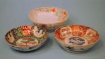 Three Oriental Design Porcelain Bowls; one hand painted with garden scene, scallop edge, 6" dia.; one hand painted birds and flowers in center, 5 3/8" dia.; one painted with rust, turquoise, grey foliage and flowers, 6" dia. Three Oriental Design Porcelain Bowls; one hand painted with garden scene, scallop edge, 6" dia.; one hand painted birds and flowers in center, 5 3/8" dia.; one painted with rust, turquoise, grey foliage and flowers, 6" dia.