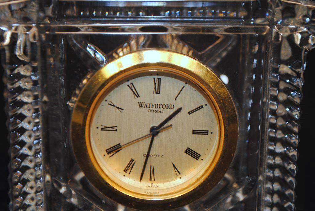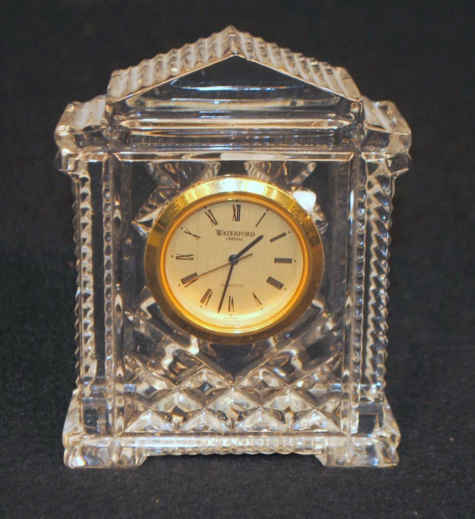 Waterford Cut Crystal 4 1/2"h Greecian table clock, signed on base, small nick to back corner base. Waterford Cut Crystal 4 1/2"h Greecian table clock, signed on base, small nick to back corner base.