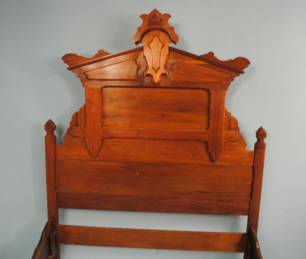 c1880 American Victorian walnut high-back bed, cartouche in the center, carving on each side of pediment, standard double size, 54" W., 79" H., 70" L. c1880 American Victorian walnut high-back bed, cartouche in the center, carving on each side of pediment, standard double size, 54" W., 79" H., 70" L.
