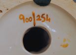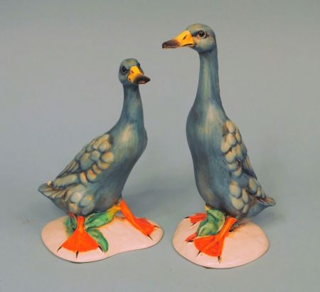 A pair of 10 1/2"h handpainted figures of blue ducks/geese, marked "900/253" and "900/254" in gilt, likely Italian pottery. A pair of 10 1/2"h handpainted figures of blue ducks/geese, marked "900/253" and "900/254" in gilt, likely Italian pottery.