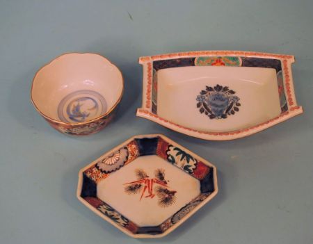 Two Japanese Imari Trays and One Rice Bowl; One tray 8" x 6"; four sided 6 1/2" x 5 1/2"; one rice bowl 4 1/2" dia. Two Japanese Imari Trays and One Rice Bowl; One tray 8" x 6"; four sided 6 1/2" x 5 1/2"; one rice bowl 4 1/2" dia.