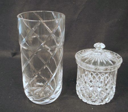 Two Crystal Glass Pieces which include a cut glass vase with spiral design, Marked "S", 9 3/8"h x 4 3/8"w; and a crystal Waterford-style biscuit jar, 8" x 5 1/4"w Two Crystal Glass Pieces which include a cut glass vase with spiral design, Marked "S", 9 3/8"h x 4 3/8"w; and a crystal Waterford-style biscuit jar, 8" x 5 1/4"w