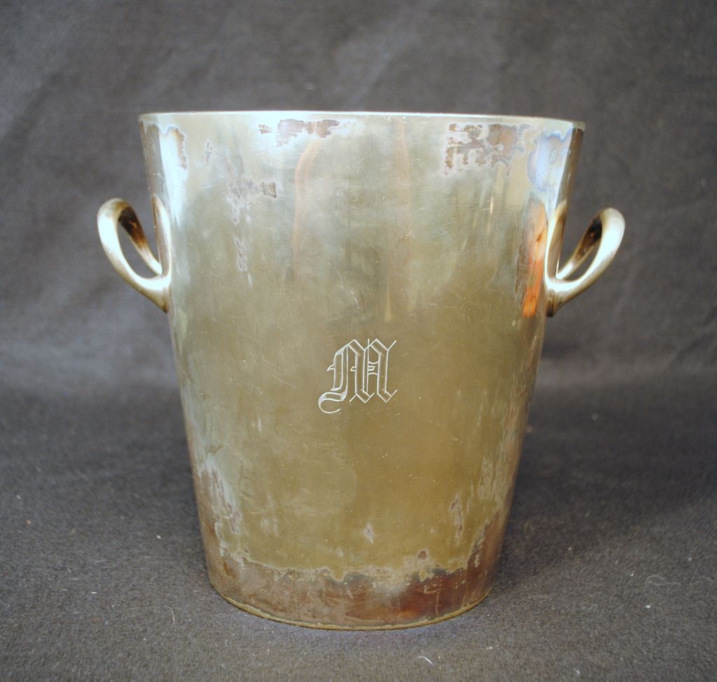 Silver Ice Bucket, electroplate two handle ice bucket with "M" monogram, 8 1/2" H., 7 3/8" dia. Silver Ice Bucket, electroplate two handle ice bucket with "M" monogram, 8 1/2" H., 7 3/8" dia.