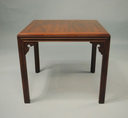A Henredon mahogany end table, 20th century, of simple Chinese Chippendale design with book-grained burled top, 22 1/2"h x 26" square A Henredon mahogany end table, 20th century, of simple Chinese Chippendale design with book-grained burled top, 22 1/2"h x 26" square