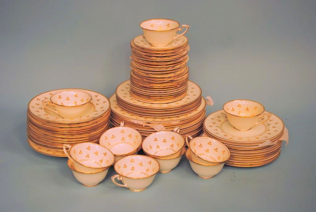 Royal Worchester China Set made in England, set includes 74 pcs; 12 Dinner Plates, 10 1/2" dia., 5 Luncheon Plates, 9" dia., 11 Salad Plates, 8" dia., 10 Bread and Butter, 6" dia. (1 repaired), 12 Saucers, 6" dia., 12 Bowls, 8 1/4" dia., 12 Cups (2 cracked/chipped) Royal Worchester China Set made in England, set includes 74 pcs; 12 Dinner Plates, 10 1/2" dia., 5 Luncheon Plates, 9" dia., 11 Salad Plates, 8" dia., 10 Bread and Butter, 6" dia. (1 repaired), 12 Saucers, 6" dia., 12 Bowls, 8 1/4" dia., 12 Cups (2 cracked/chipped)