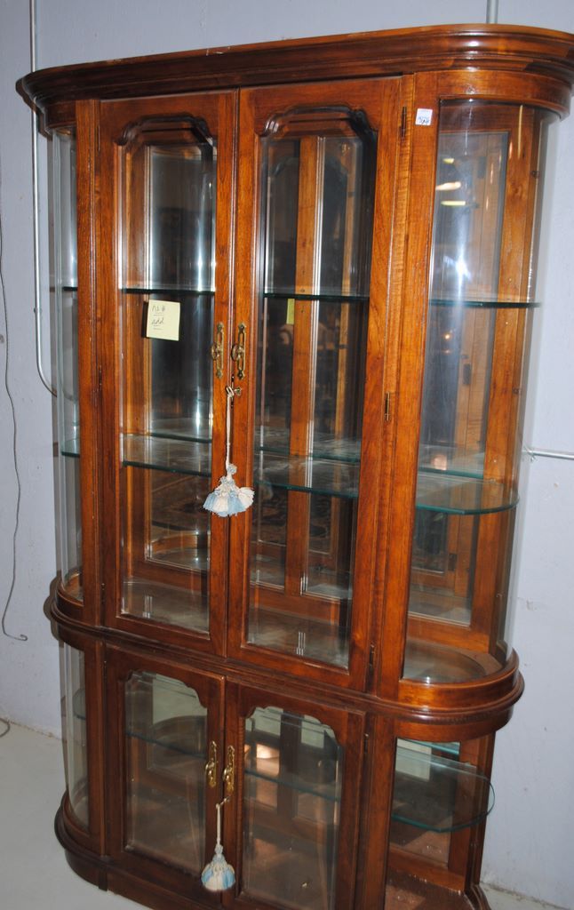 Four beveled glass door lighted curio cabinet. Two doors, 3 shelves on top and two doors one glass shelf on bottom. Curved glass on each side. W. 49" d.13" H. 76 1/2" Four beveled glass door lighted curio cabinet. Two doors, 3 shelves on top and two doors one glass shelf on bottom. Curved glass on each side. W. 49" d.13" H. 76 1/2"