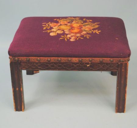 Vintage Chinese Chippendale Style Stool With Purple Needlepoint Top, 15" W., 11" d., 9" H. Vintage Chinese Chippendale Style Stool With Purple Needlepoint Top, 15" W., 11" d., 9" H.