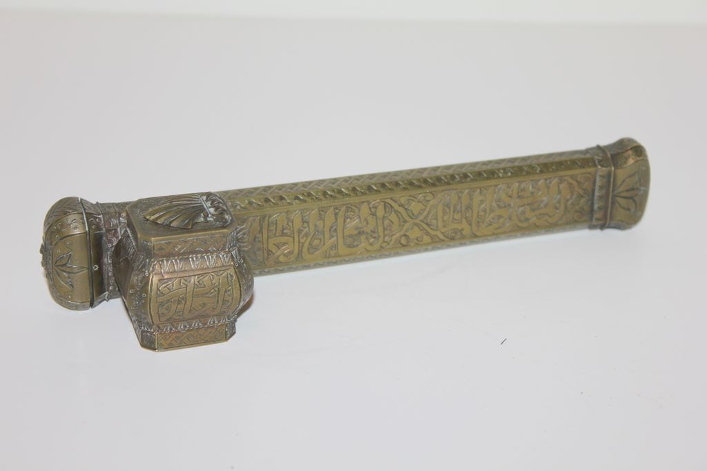 A c1900 Islamic traveling scribe's qalamdan, likely Egyptian, 8 1/2" w, combining an inkwell and a pen-case and carried in the scribe's belt or girdle. Also known as a divet, this example is intricately engraved brass, with tight fitting hinged inkwell cap and hinged pen-case cap. A c1900 Islamic traveling scribe's qalamdan, likely Egyptian, 8 1/2" w, combining an inkwell and a pen-case and carried in the scribe's belt or girdle. Also known as a divet, this example is intricately engraved brass, with tight fitting hinged inkwell cap and hinged pen-case cap.