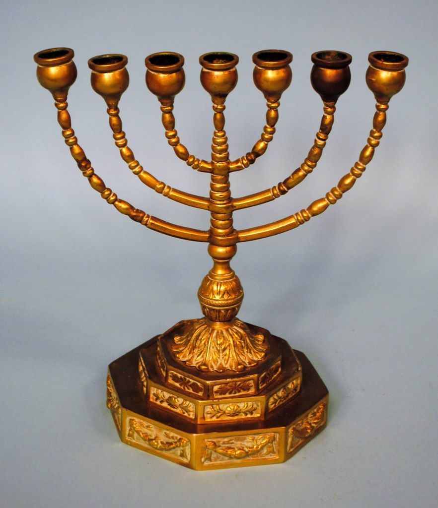 A 19th century brass Menorah, 11 1/4"h x 9 3/4"w, likely Italian. Damage to base, old solder repairs to underside. A 19th century brass Menorah, 11 1/4"h x 9 3/4"w, likely Italian. Damage to base, old solder repairs to underside.