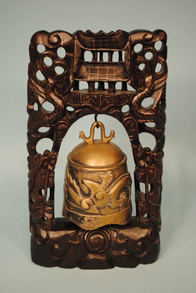 A Burmese traveling ceremonial cast brass 6 1/2" bell decorated with a fierce archaic-style dragon, suspended from a silver-inlaid teak stand with hand carved dragons. Stand 15"h x 8 1/2"w A Burmese traveling ceremonial cast brass 6 1/2" bell decorated with a fierce archaic-style dragon, suspended from a silver-inlaid teak stand with hand carved dragons. Stand 15"h x 8 1/2"w