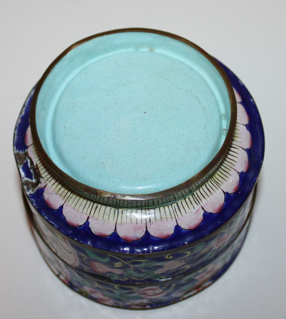 c1900 Canton Peking Enamel (wireless cloisonne) stacking Food box, two bowl sections with original lid, 4 3/8"h x 4 1/2"w. c1900 Canton Peking Enamel (wireless cloisonne) stacking Food box, two bowl sections with original lid, 4 3/8"h x 4 1/2"w.