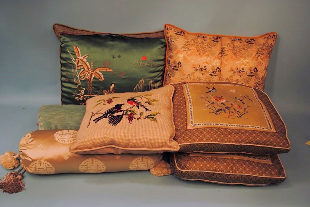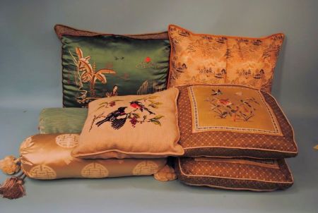 Seven Decorative Throw Pillows: One large green silk hand-embroidered with a geisha on a bridge, 16" x 19"; two 18" silk bolster pillows with tassels; a pair of 15 1/2" square silk with hand-embroidered birds and peonies (front & sides fine, both backings frayed); one 13 1/2" square needlepoint birds (not silk); and an 18" x 20" silk brocade of pagodas. Seven Decorative Throw Pillows: One large green silk hand-embroidered with a geisha on a bridge, 16" x 19"; two 18" silk bolster pillows with tassels; a pair of 15 1/2" square silk with hand-embroidered birds and peonies (front & sides fine, both backings frayed); one 13 1/2" square needlepoint birds (not silk); and an 18" x 20" silk brocade of pagodas.
