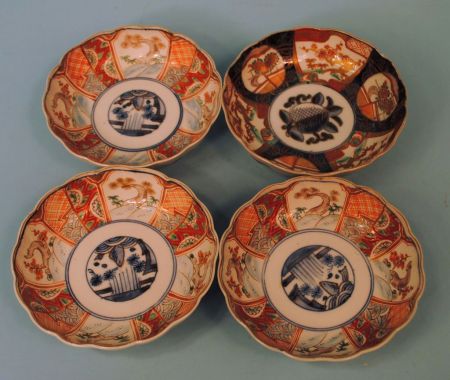 235 Four Japanese Fluted Imari Bowls Miji c1880, Brocaded & "Royal Peach"