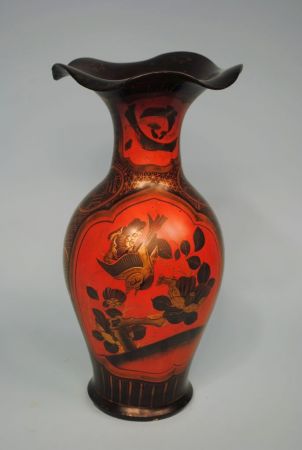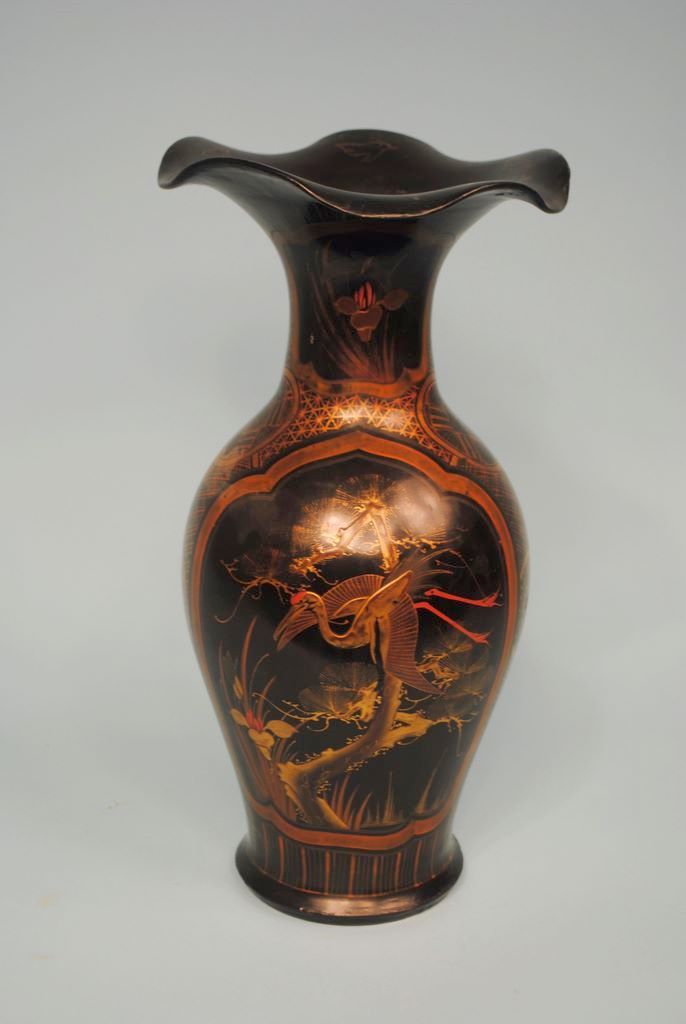 A fine Japanese 17"h Lacquer on Porcelain baluster vase, decorated on one side with a bird and flowering tree branch on red lacquer ground; on the reverse with a flying crane and a willow tree on black lacquer. Intricately gilded, with professional old repairs (difficult to identify) to fluted rim. A fine Japanese 17"h Lacquer on Porcelain baluster vase, decorated on one side with a bird and flowering tree branch on red lacquer ground; on the reverse with a flying crane and a willow tree on black lacquer. Intricately gilded, with professional old repairs (difficult to identify) to fluted rim.