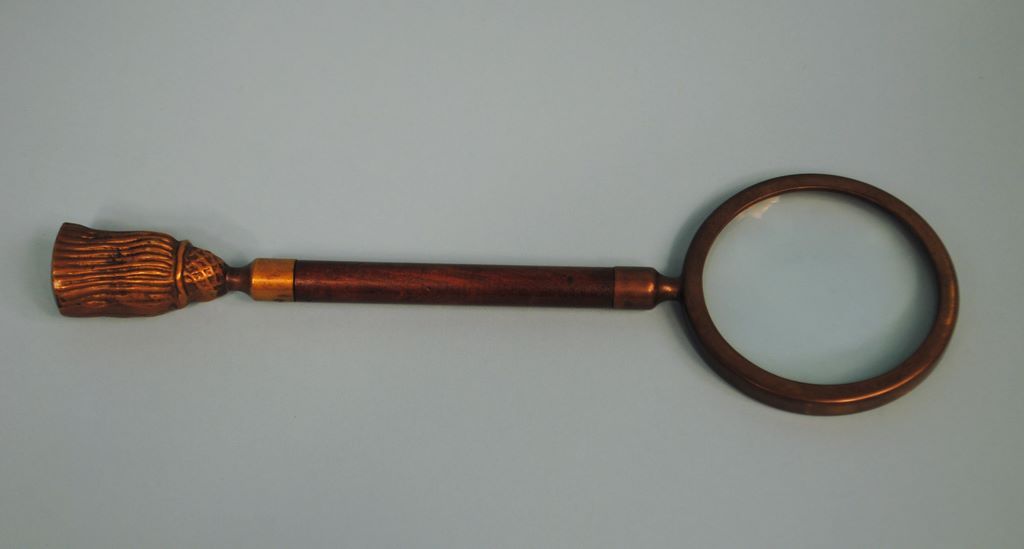Georgian Brass-Mounted Magnifying Glass, mahogany stem with a Bronze Tassel mounted at the end. Georgian Brass-Mounted Magnifying Glass, mahogany stem with a Bronze Tassel mounted at the end.
