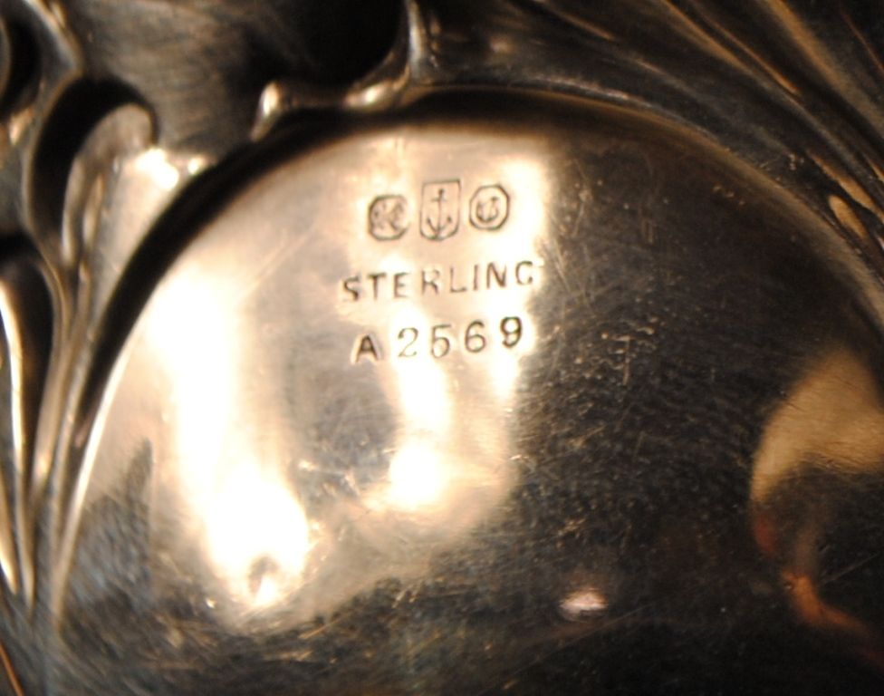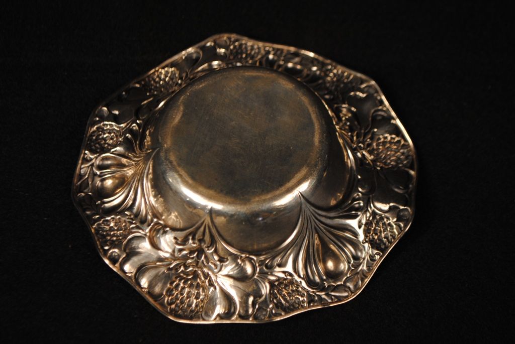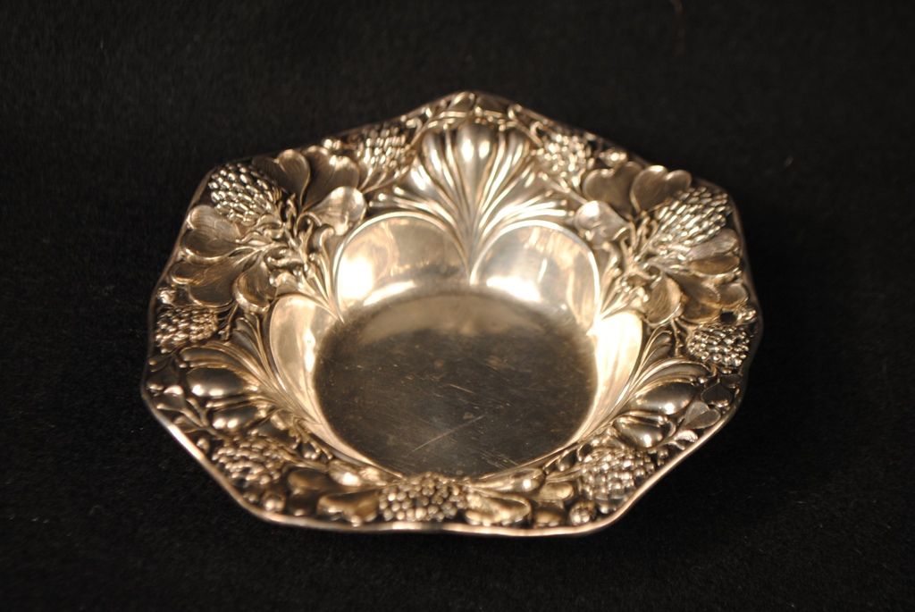 An exceptional Gorham Art Nouveau 5 1/2" sterling silver bowl heavily embossed with a wide border of clover flowers and leaves, Gorham hallmarks and # A2569 An exceptional Gorham Art Nouveau 5 1/2" sterling silver bowl heavily embossed with a wide border of clover flowers and leaves, Gorham hallmarks and # A2569
