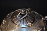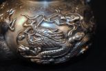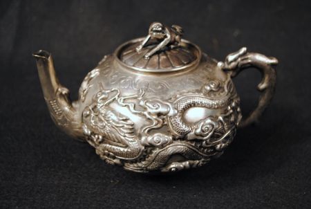 c1875-1900 Chinese export silver teapot decorated with cast & applied dragons, original lid with foo dog finial, 4 1/2"h x 7"w. Signed with a chop mark & numeral 8. c1875-1900 Chinese export silver teapot decorated with cast & applied dragons, original lid with foo dog finial, 4 1/2"h x 7"w. Signed with a chop mark & numeral 8.