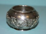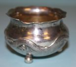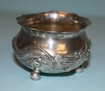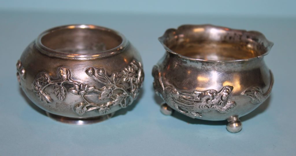 Two c1875-1925 Chinese export silver (.90) sterling silver salt dips: A footed cauldron-style by Wang Hing with a cast & applied dragon circling the bowl; the second by Luen Hing with cast & applied floral decoration. Two c1875-1925 Chinese export silver (.90) sterling silver salt dips: A footed cauldron-style by Wang Hing with a cast & applied dragon circling the bowl; the second by Luen Hing with cast & applied floral decoration.