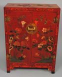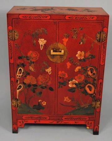 Pre-World War 2, Chinese red lacquer two-door cabinet with finely handpainted design of Asian birds and flowers. Original Ming-style brasses with brass Chinese lock, interior has one shelf. 31" w., 15" d., 43 1/4" H. Pre-World War 2, Chinese red lacquer two-door cabinet with finely handpainted design of Asian birds and flowers. Original Ming-style brasses with brass Chinese lock, interior has one shelf. 31" w., 15" d., 43 1/4" H.