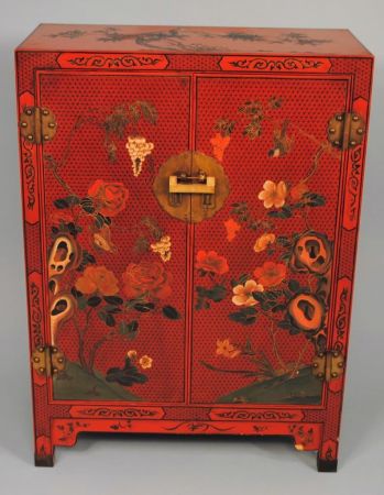Pre-World War 2, Chinese red lacquer two-door cabinet with finely handpainted design of Asian birds and flowers. Original Ming-style brasses with brass Chinese lock, interior has one shelf. 31" w., 15" d., 43 1/4" H. Pre-World War 2, Chinese red lacquer two-door cabinet with finely handpainted design of Asian birds and flowers. Original Ming-style brasses with brass Chinese lock, interior has one shelf. 31" w., 15" d., 43 1/4" H.