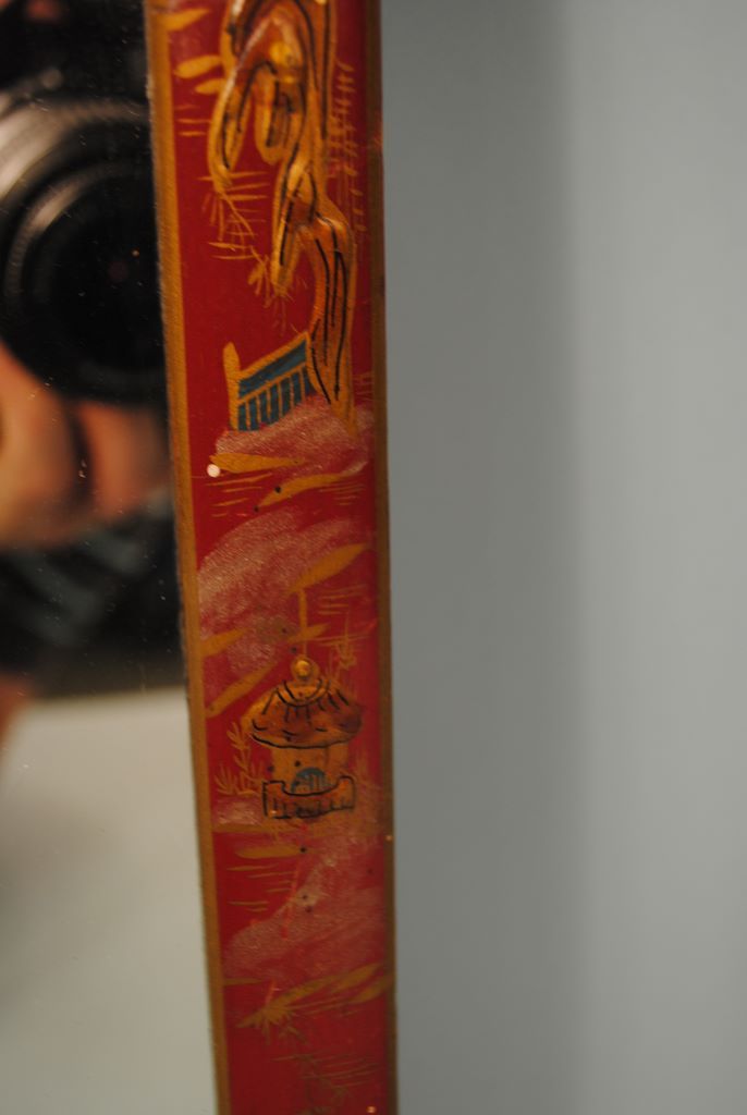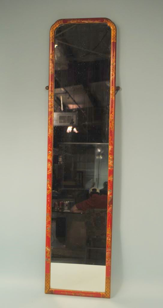 Chinoiserie Red Lacquer Mirror, 55" H., 13 1/2" W. Chinoiserie Red Lacquer Mirror, 55" H., 13 1/2" W.