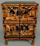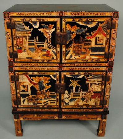 Chinese Lacquer Hand-Painted Cabinet; black lacquer hand painted in oriental garden scenes, two sections each having two doors; Possibly painted by Japanese, 48" H., 19" d., 35" W. Chinese Lacquer Hand-Painted Cabinet; black lacquer hand painted in oriental garden scenes, two sections each having two doors; Possibly painted by Japanese, 48" H., 19" d., 35" W.