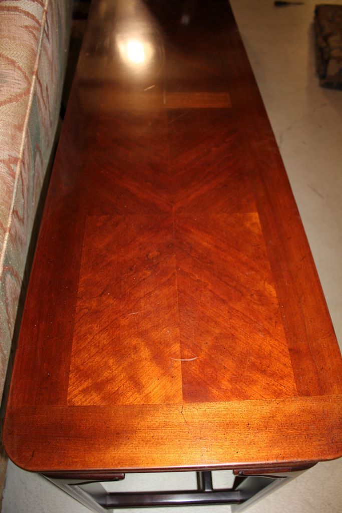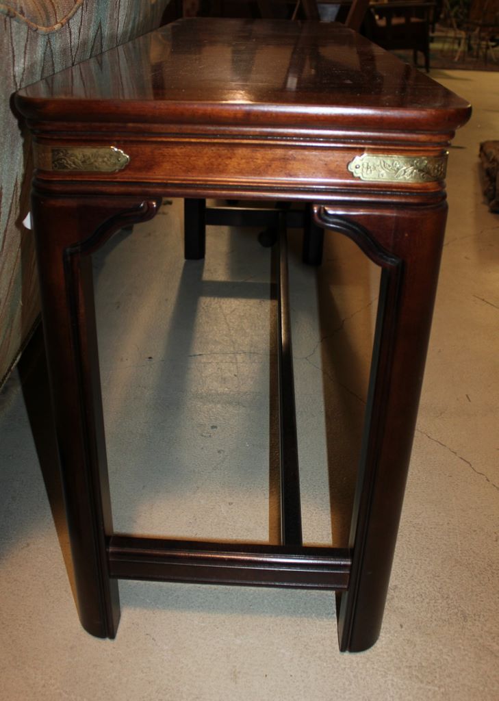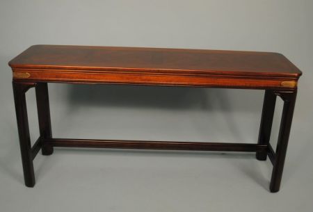 A Chinese Chippendale Console Table by Gordon Fine Furniture, 54" w., 26 1/2" H., 15 3/8" d, with mahogany "book-grained burling" and brass decorative fittings. A Chinese Chippendale Console Table by Gordon Fine Furniture, 54" w., 26 1/2" H., 15 3/8" d, with mahogany "book-grained burling" and brass decorative fittings.