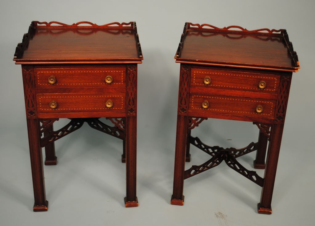 An early 20th century pair of mahogany Chinese Chippendale end tables with pierced gallery top, satinwood & ebony striped drawers, original brasses, and pierced fretwork cross-stretchers. One gallery has repair. W. 18", d. 18", h. 29". An early 20th century pair of mahogany Chinese Chippendale end tables with pierced gallery top, satinwood & ebony striped drawers, original brasses, and pierced fretwork cross-stretchers. One gallery has repair. W. 18", d. 18", h. 29".