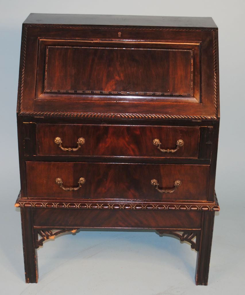 Late 19th century Mahogany Chinese Chippendale Fall Front Desk, interior fitted with cubbyholes, two drawers, some damage, 39 1/2" H., 29" w., 17" d. Late 19th century Mahogany Chinese Chippendale Fall Front Desk, interior fitted with cubbyholes, two drawers, some damage, 39 1/2" H., 29" w., 17" d.