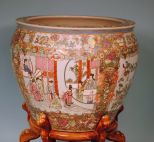 309 Large Chinese Porcelain Famille Rose Fish Bowl with Rosewood Stand