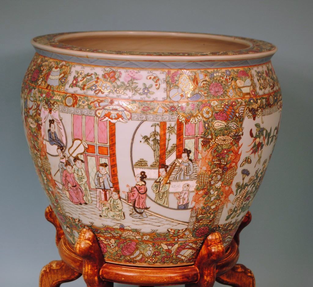 A Chinese Porcelain Famille Rose fish bowl/jardiniere on rosewood stand. The fish bowl is (15"h X 16"w), the wooden stand is 10"h, overall height 25"h. A Chinese Porcelain Famille Rose fish bowl/jardiniere on rosewood stand. The fish bowl is (15"h X 16"w), the wooden stand is 10"h, overall height 25"h.