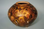 Chinese Bulb Pot with Taoist Buddhas with moriage beaded dragons, 9 3/8"h x 12"w. , gold decorated on three feet. Gilt marks on rust-red seal, missing lid. Chinese Bulb Pot with Taoist Buddhas with moriage beaded dragons, 9 3/8"h x 12"w. , gold decorated on three feet. Gilt marks on rust-red seal, missing lid.