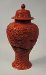 A large c1930 16"h. Chinese baluster form Red Cinnabar black Lacquer covered urn, intricately carved with landscape scenes and figures. A large c1930 16"h. Chinese baluster form Red Cinnabar black Lacquer covered urn, intricately carved with landscape scenes and figures.