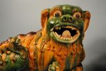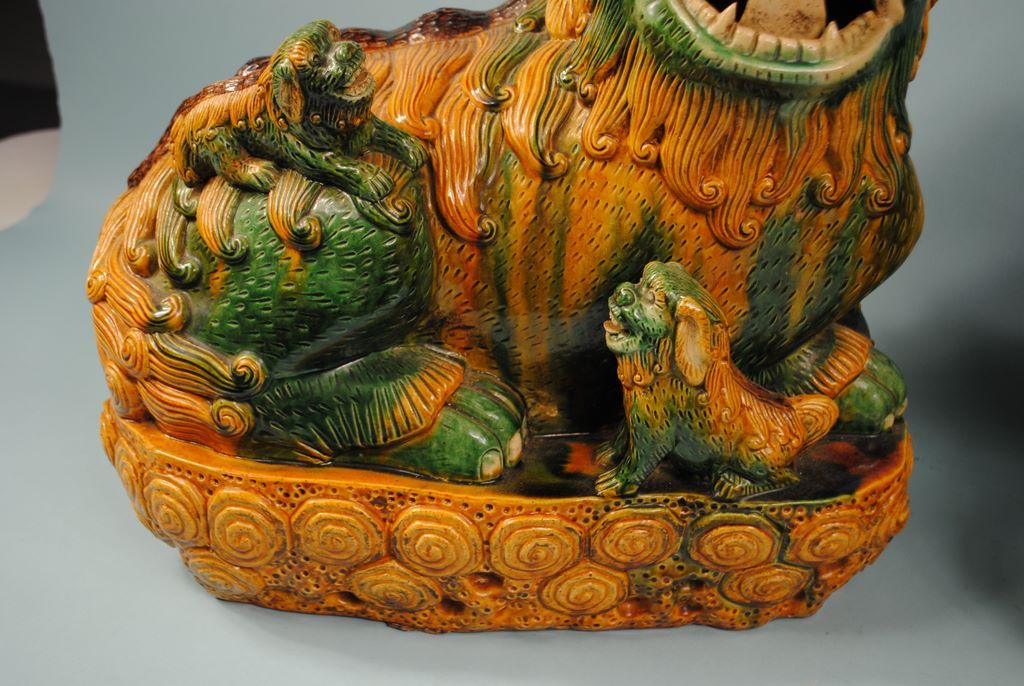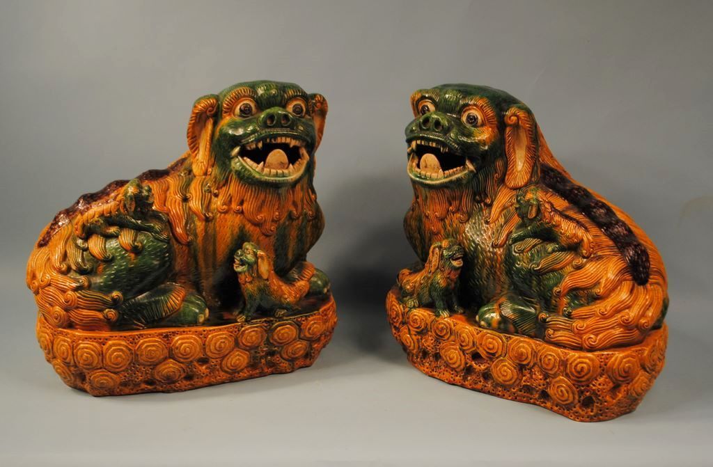 Pair of Large Chinese Pottery Glazed Foo Dogs c1920 Republic Period Done in Tang Dynasty Style, 16 1/2"h x 15 1/2"w x 9"d. Pair of Large Chinese Pottery Glazed Foo Dogs c1920 Republic Period Done in Tang Dynasty Style, 16 1/2"h x 15 1/2"w x 9"d.