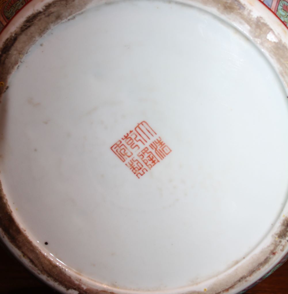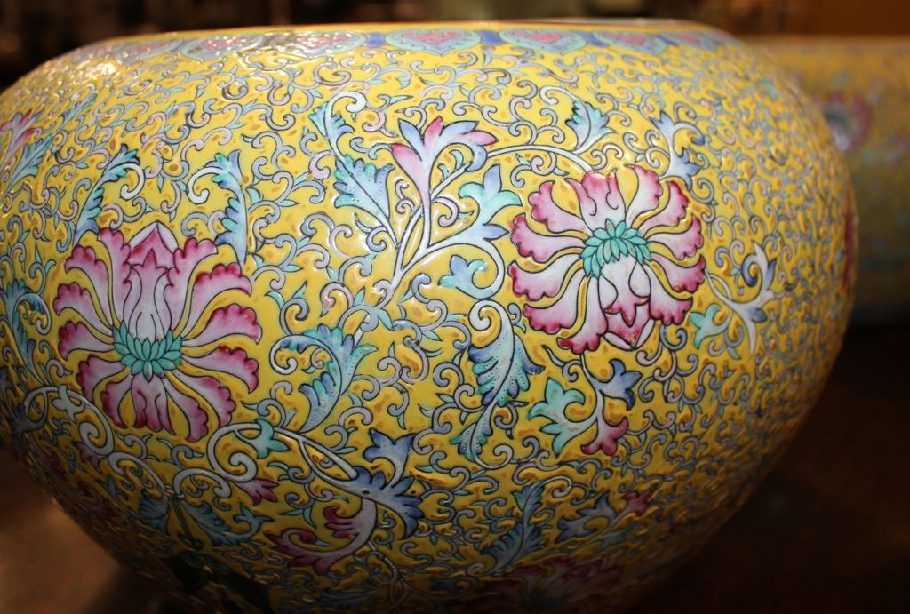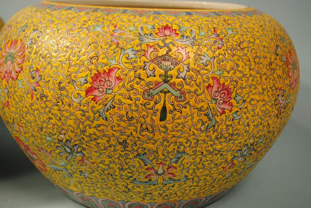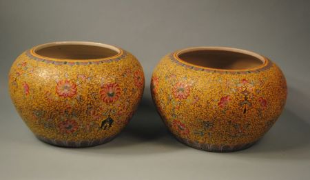 Pair Chinese Famille Rose bulb pots c1920, hand decorated with richly textured enamels on yellow ground. Pink flowers with scrolling in turquoise, turquoise and pink hearts creating a border. 13 1/2" dia., 9 1/2" H. Pair Chinese Famille Rose bulb pots c1920, hand decorated with richly textured enamels on yellow ground. Pink flowers with scrolling in turquoise, turquoise and pink hearts creating a border. 13 1/2" dia., 9 1/2" H.
