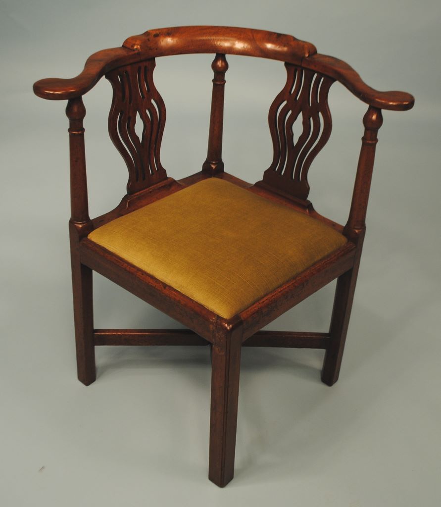 Georgian Walnut Chippendale Corner Chair, late 18th/ early 19th century, yoke back with two carved splats, pegged construction, slip seat, H. 30 1/4", W. 25", D. 24" Georgian Walnut Chippendale Corner Chair, late 18th/ early 19th century, yoke back with two carved splats, pegged construction, slip seat, H. 30 1/4", W. 25", D. 24"
