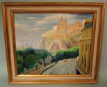 Mildred Nungester Wolfe (1912-2009), Jackson, Mississippi, original painting on canvas of an Edinburgh, Scotland landscape, fully signed and dated 1984 (lower right), 20" x 24", 25 1/2" x 29 1/2" in original hand painted Wolfe Studios frame. Collection of Leigh Barrett Latimer Mildred Nungester Wolfe (1912-2009), Jackson, Mississippi, original painting on canvas of an Edinburgh, Scotland landscape, fully signed and dated 1984 (lower right), 20" x 24", 25 1/2" x 29 1/2" in original hand painted Wolfe Studios frame. Collection of Leigh Barrett Latimer