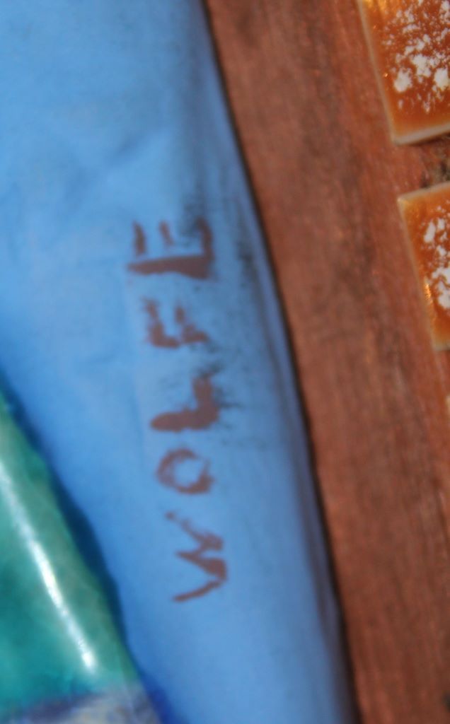 Wolfe Studios hand painted 3 1/4" x 9 1/2"h ceramic panel of a Wise Man, original mounting on heart pine surrounded by mosaic tiles, overall size 5 1/2" x 12". Signed "Wolfe" in gilt on right lower side, attributed to Mildred Wolfe. Collection of Leigh Barrett Latimer Wolfe Studios hand painted 3 1/4" x 9 1/2"h ceramic panel of a Wise Man, original mounting on heart pine surrounded by mosaic tiles, overall size 5 1/2" x 12". Signed "Wolfe" in gilt on right lower side, attributed to Mildred Wolfe. Collection of Leigh Barrett Latimer