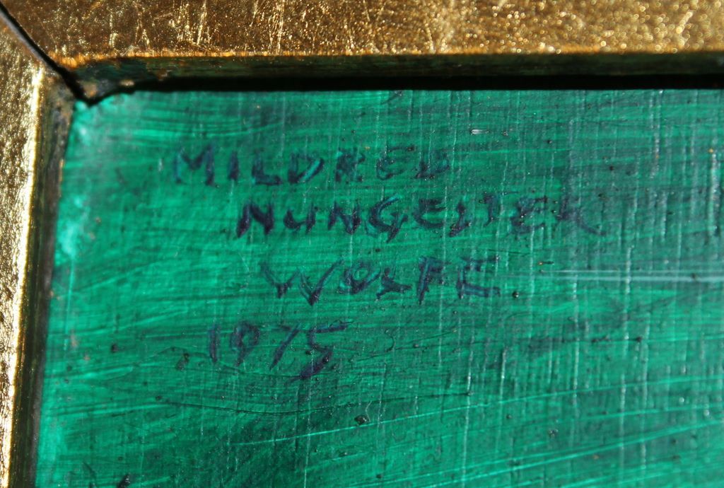 Mildred Nungester Wolfe (1912-2009), Jackson, Mississippi, gold leaf and acrylic on board painting of an Angel and Madonna, 8" x 10", in Wolfe Studios 12 1/2" x 14 1/2" gold leafed frame, fully signed and dated 1975 upper left corner. Collection of Leigh Barrett Latimer Mildred Nungester Wolfe (1912-2009), Jackson, Mississippi, gold leaf and acrylic on board painting of an Angel and Madonna, 8" x 10", in Wolfe Studios 12 1/2" x 14 1/2" gold leafed frame, fully signed and dated 1975 upper left corner. Collection of Leigh Barrett Latimer