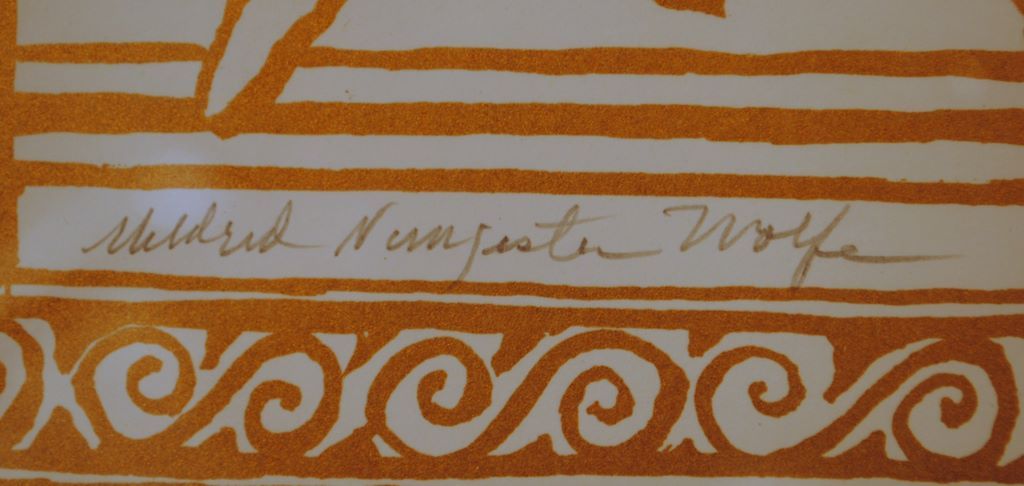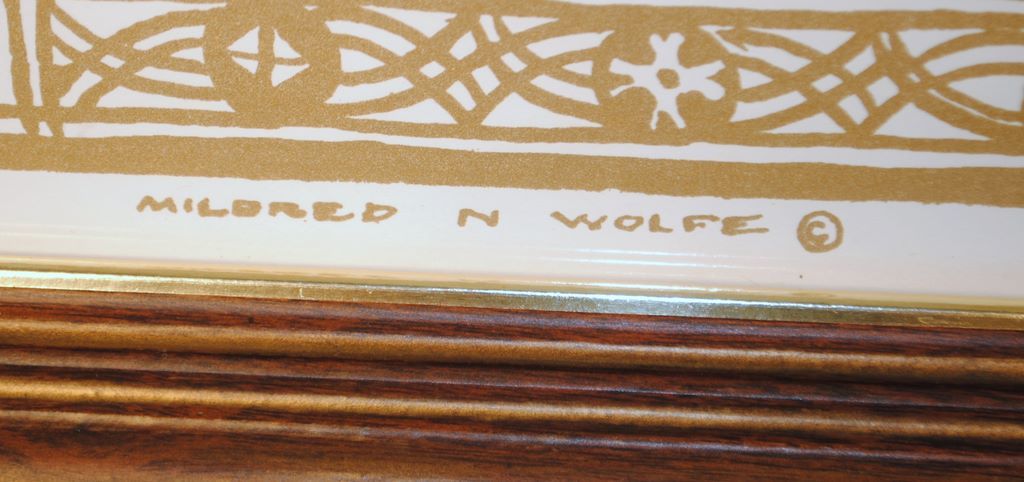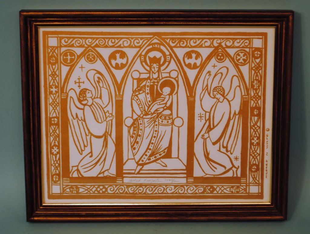 Mildred Nungester Wolfe (1912-2009), Jackson, Mississippi, gilt triptych block print of the Madonna and Child flanked by angels, 11" x 14", 12 1/2" x 15 1/2" framed, fully signed in pencil lower center. Collection of Leigh Barrett Latimer Mildred Nungester Wolfe (1912-2009), Jackson, Mississippi, gilt triptych block print of the Madonna and Child flanked by angels, 11" x 14", 12 1/2" x 15 1/2" framed, fully signed in pencil lower center. Collection of Leigh Barrett Latimer