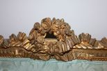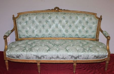 French Louis XVI style carved gilted Settee with light blue upholstery, 19th Century, with pleated padded back surmounted with a wreath and cornered with finials, reeded stiles, leaf carved arm supports and pleated bowed seat, raised on tapered reeded legs. (matches lot 387) 6' w, 40" h., 28" d. French Louis XVI style carved gilted Settee with light blue upholstery, 19th Century, with pleated padded back surmounted with a wreath and cornered with finials, reeded stiles, leaf carved arm supports and pleated bowed seat, raised on tapered reeded legs. (matches lot 387) 6' w, 40" h., 28" d.