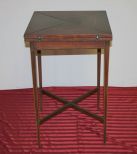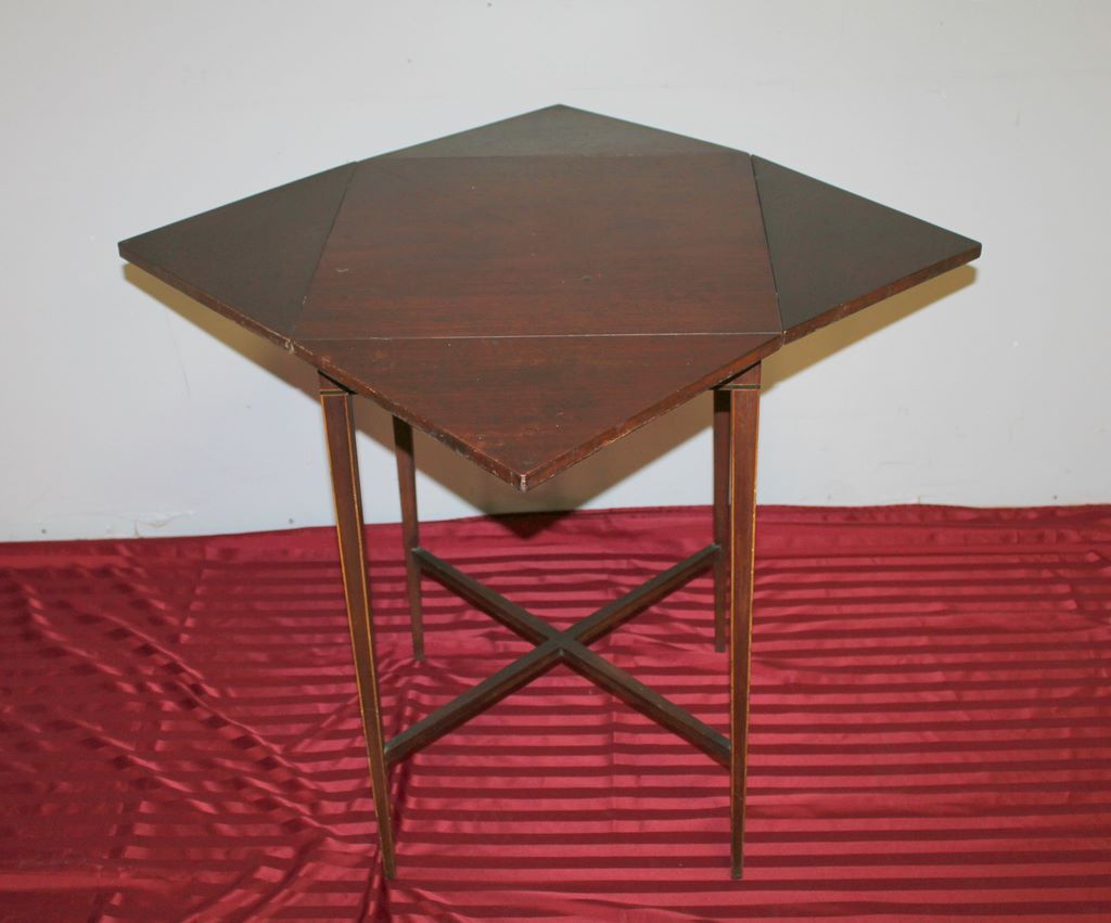Mahogany Handkerchief Table with Inlaid Design, with four foldout leaves and bottom shelve. 29" h, 18" square closed, 25 1/2" opened. Mahogany Handkerchief Table with Inlaid Design, with four foldout leaves and bottom shelve. 29" h, 18" square closed, 25 1/2" opened.