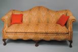 Chippendale style Camel Back Sofa, with a stepped hump back and outswept scroll arms, raised on carved claw and ball feet, flame upholstery, H. 35", L. 74" Chippendale style Camel Back Sofa, with a stepped hump back and outswept scroll arms, raised on carved claw and ball feet, flame upholstery, H. 35", L. 74"
